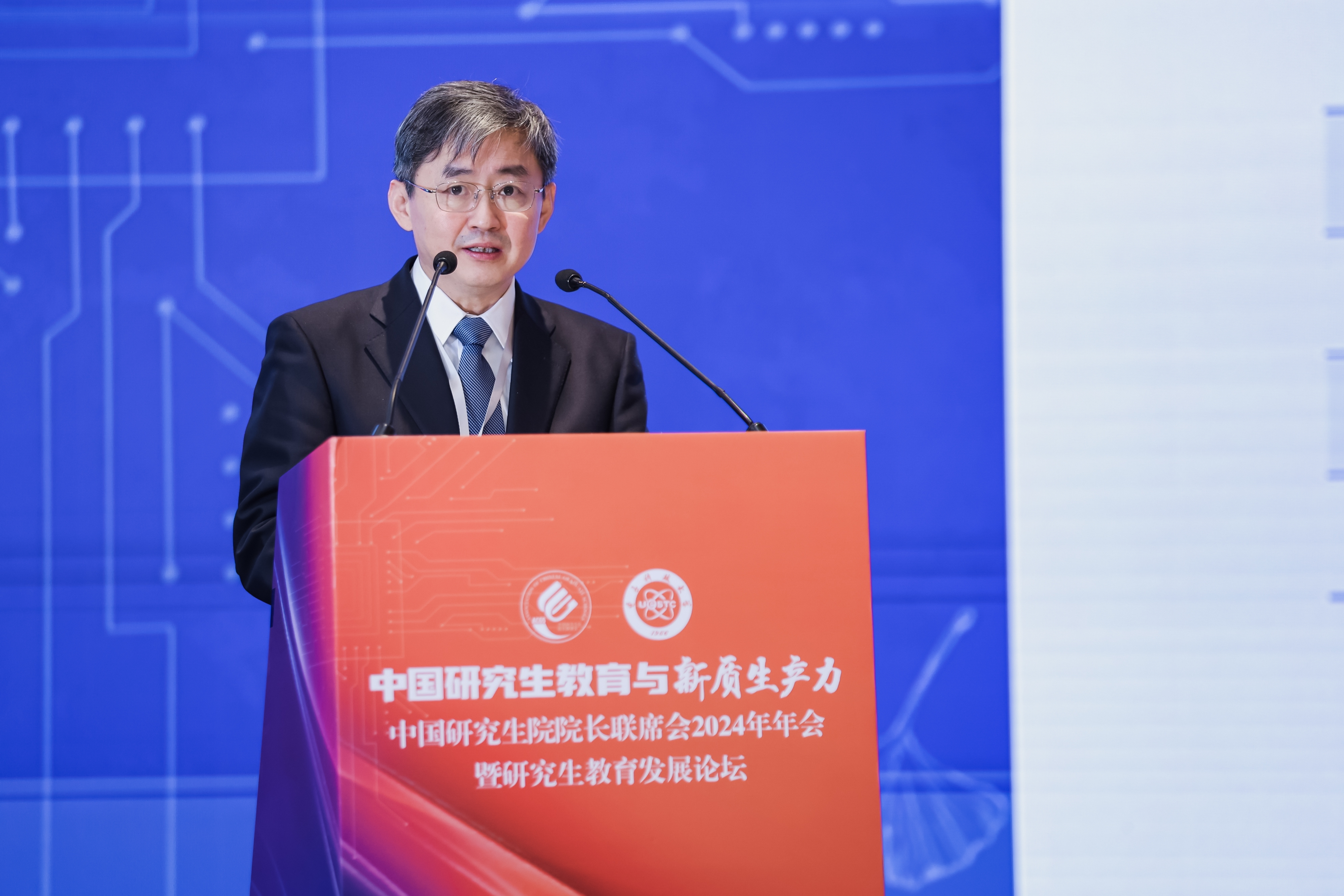 在主旨报告环节,四位特邀报告嘉宾从科研探索、产业进步、自主知识体系建立和高校管理等不同角度,破解新质生产力助力中国研究生教育发展的关键问题。