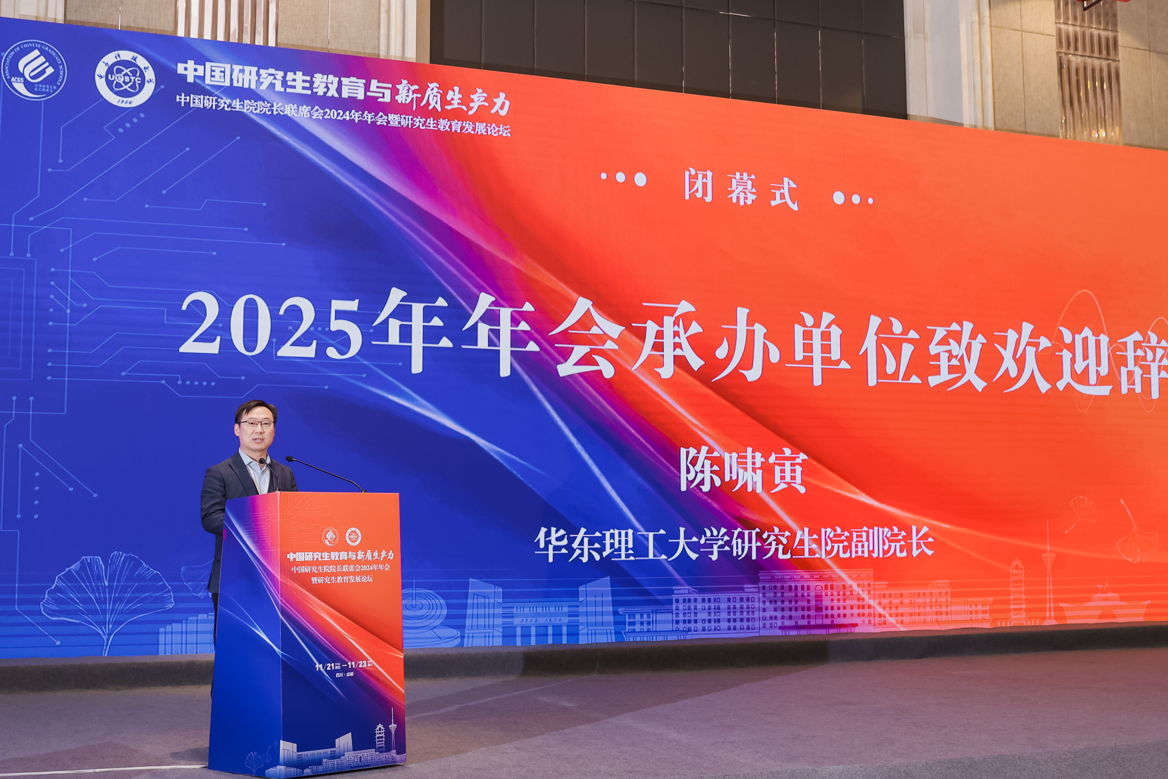 中国研究生院院长联席会2025年年会承办单位华东理工大学研究生院展示了学校宣传片,副院长陈啸寅代表学校向会员单位发出邀请。